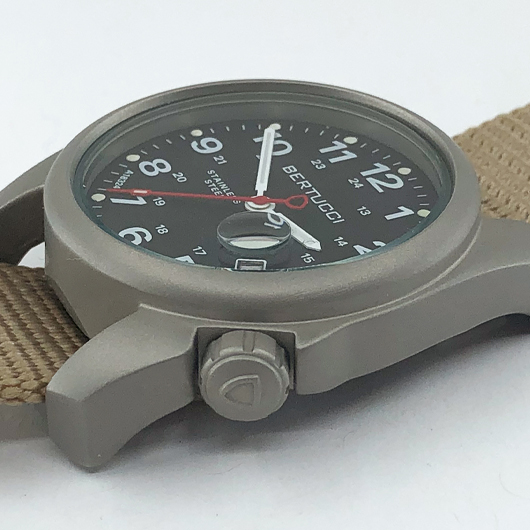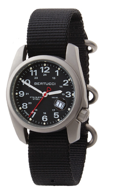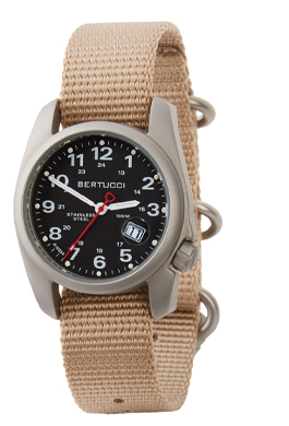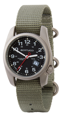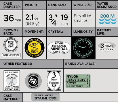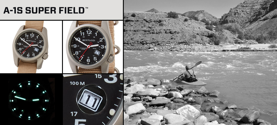 The A-1S Super Field™ features a traditionally sized 36 mm sand blasted matte finish stainless steel case. A true classic based on essential function well done...featuring durability, reliability, comfort, a clean easy to read dial, and large date with a magnifier that increases visibility 2.5 times. Field duty equipped with rugged screw down crown & case back, 100 M water resistance, U.S. Patented Unibody™ case, long lasting B-Type nylon webbing band, R-Type hardened mineral crystal, precision gold plated movement, and Swiss super luminous hands & markers.