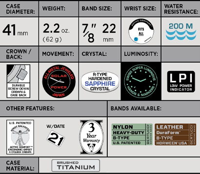 • Long lasting U.S. Patented B-TYPE nylon webbing band & B-TYPE DuraForm™ Horween® leather band