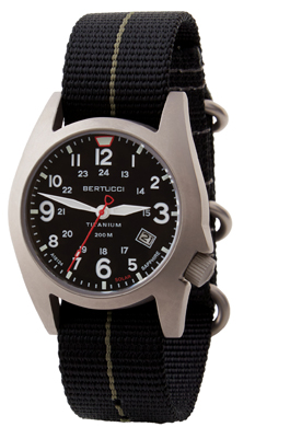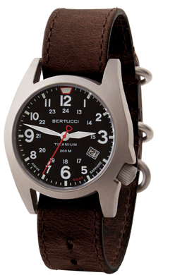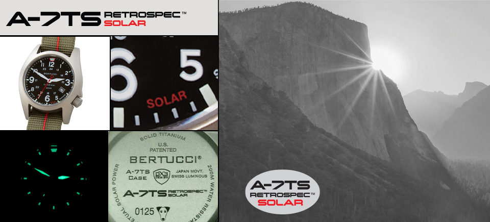 The Bertucci® A-7TS RETROSPEC™ Solar field watch features a solid titanium U.S. Patented Unibody™ 41 mm case that is a clean functional design with a retro feel. It is equipped with a precision solar powered all-metal movement that has 6 month power reserve, excellent accuracy & reliability... and requires no battery changing or charging. The matte finish titanium case offers excellent durability and lightweight comfort. The functional high contrast dial is easy to read and offers 12-24 hour time w/ date. Also, equipped with a scratch resistant R-Type sapphire crystal, rugged screw down crown & back, Active Comfort™ band, Swiss super luminous hands & markers, & 200 M water resistance.