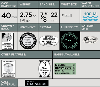 B-TYPE Heavy-Duty Nylon Webbing Band offers long lasting durability and comfort unmatched in the marketplace. Featuring military spec. nylon webbing, heavy-duty stitching, and solid stainless steel buckle and dual loop keepers. The Active Comfort™ one piece design is equipped with the Fold and Tuck™ excess band retention feature and wide adjustment range to ensure a perfect fit for all wrist sizes. |