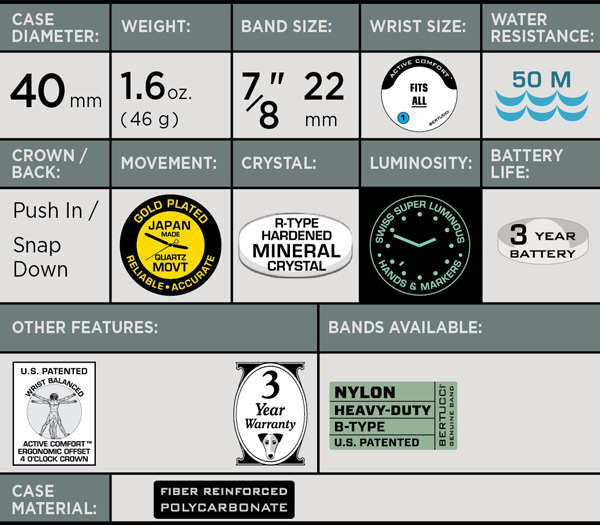 Office Hours: 8:30 – 5:00 M–F central standard time, USA Bertucci® Ultimate Field Watch™ |