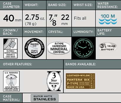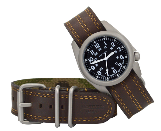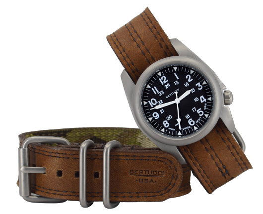 The Bertucci® A-2S Pantera™ Six field watch combines both functional & versatile styling with a vintage U.S. Patented design that offers durability and comfort. Equipped with our innovative Pat. Pend. made in USA Pantera™ Six waterproof leather band. Featuring jacquard webbing lining and utilizing six row stitching for extreme durability and custom wrist forming Active Comfort™ fit.