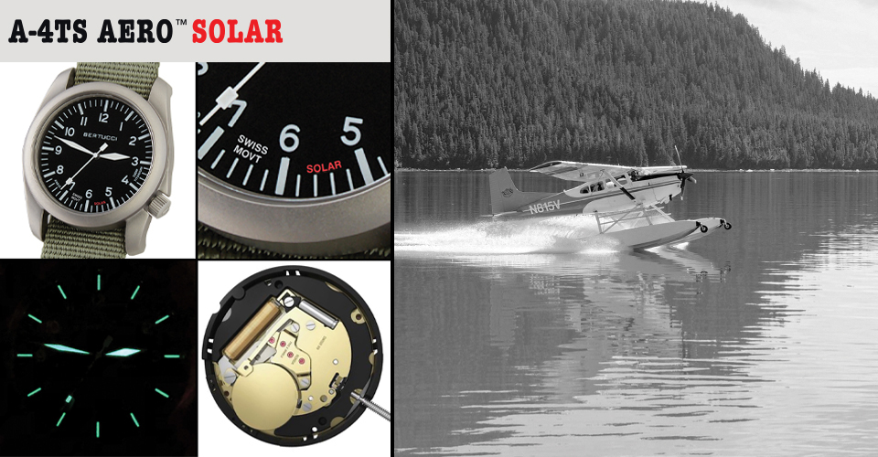 The AERO™ Solar is inspired by WW2 pilot watches. The period authentic design is clean and functional. It features a precision Swiss made solar powered quartz, gold plated & jeweled movement to ensure reliable long life, 8 month power reserve and extreme accuracy. There is no need to charge or change batteries... simply wear it with maintenance free operation indefinitely. The AERO™ features our legendary 44 mm U.S. Patented Unibody™ solid titanium case for unmatched durability and comfort. The Active Comfort™ wrist balanced case features an impressive 200 M water resistance, R-Type sapphire crystal, and a screw down crown & case back. Versatile, refined and distinctive... authentic gear for the professional.
