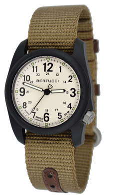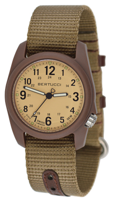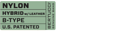 Bertucci® HYBRID™ Nylon + Leather band combines leather accents and our U.S. Patented B-Type nylon webbing to create a new, durable hybrid band. Rugged dark brown top grain vegetable tanned leather is used for the dual keeper loops and to reinforce the adjustment holes to create a refined classic design. One size fits all. |