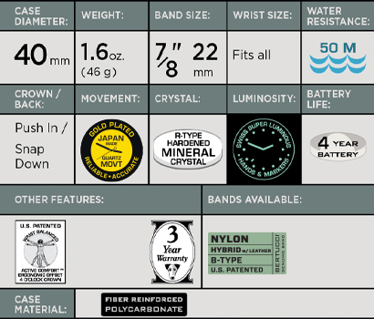 The DX3® HYBRID™ is a classic & distinctive field watch design. It features our rugged U.S. Patented Unibody™ 40 mm fiber reinforced polycarbonate case combined with our HYBRID leather reinforced nylon band offering long lasting durability, style & comfort. This watch and band will provide years of reliable performance.